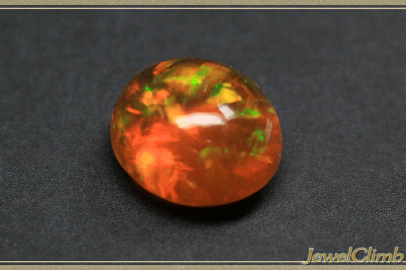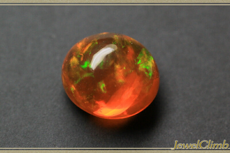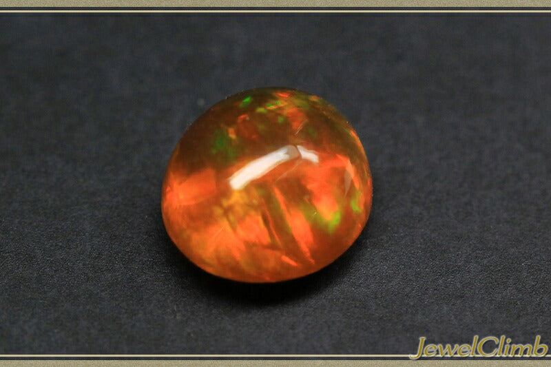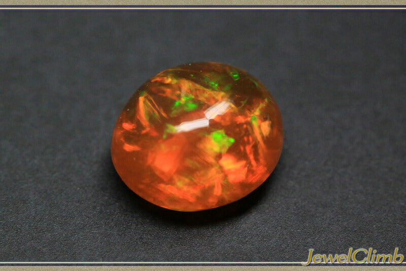 The plump cabochon crystal has few inclusions and the orange-red and green play of colors is a truly fantastic stone.