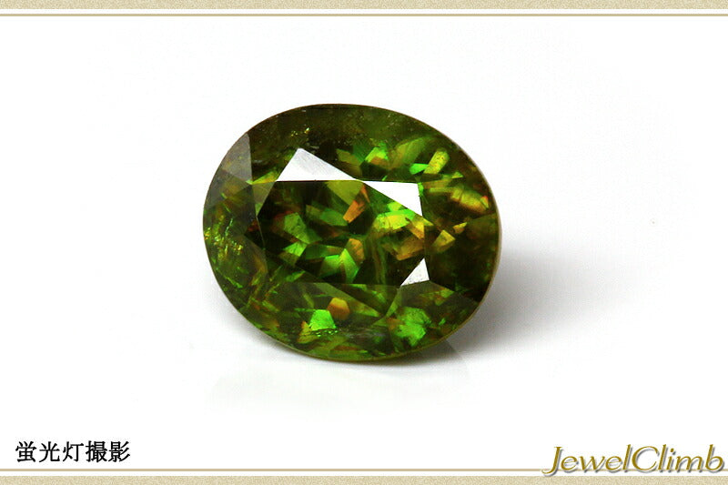 深い森を思わせる濃いグリーンカラーをオーバルカットで上品に輝かせる姿。 透明感も高く、スフェーン特有の虹色のファイアはきらきらと地色の合間に出現し神秘的な光彩を魅せています。 スフェーンといえばダイヤモンドを上回る光の分散率を持つことによりギラギラとした美しい輝きを見せる人気の高い宝石。 特にこちらの結晶のご注目いただきたい点は白熱系のライトを当てることで赤の輝きが出現する魅惑のスフェーンです。 通常のスフェーンも稀少性が高いですがこちらのタイプのスフェーンもとても珍しく海外ではカラーチェンジスフェーンとも呼ばれており当店でも高い人気を誇るレアストーンです。 鑑別書付きでのご案内となりますのでコレクションストーンとしても大変お勧めです。 神秘的な美しさを強く主張するこのクロムスフェーン。 お手元にて神秘のスフェーンをお楽しみください。 |