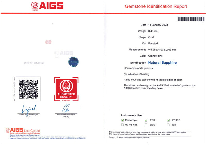 | 【AIGS非加熱ルース鑑別書付き】 希少な非加熱高品質結晶! 非加熱パパラチャサファイア0.43CT