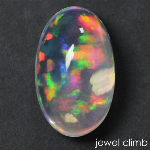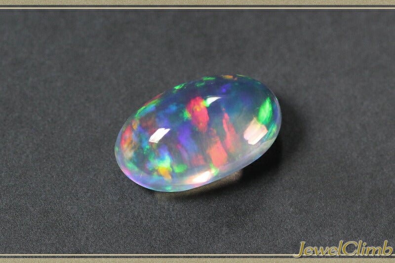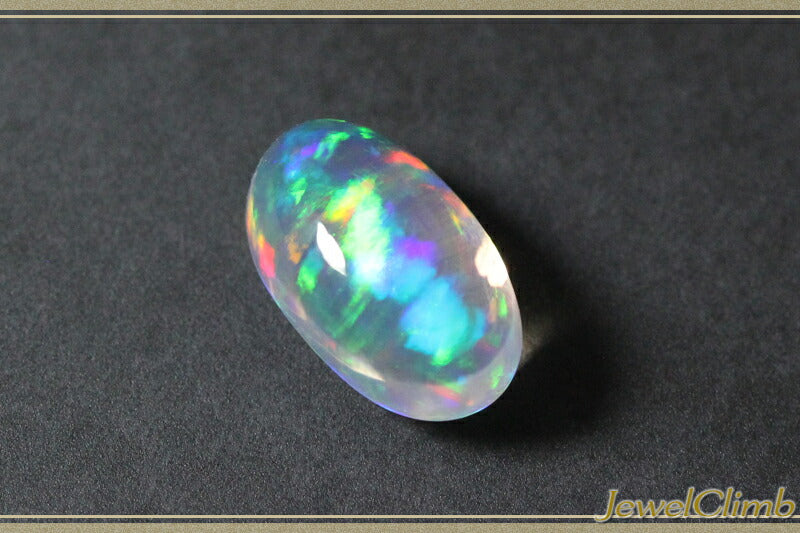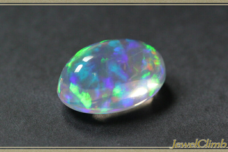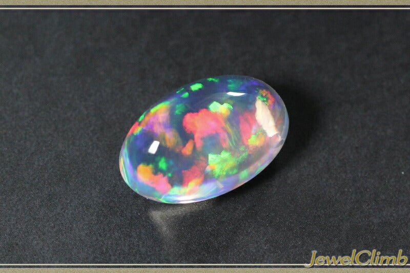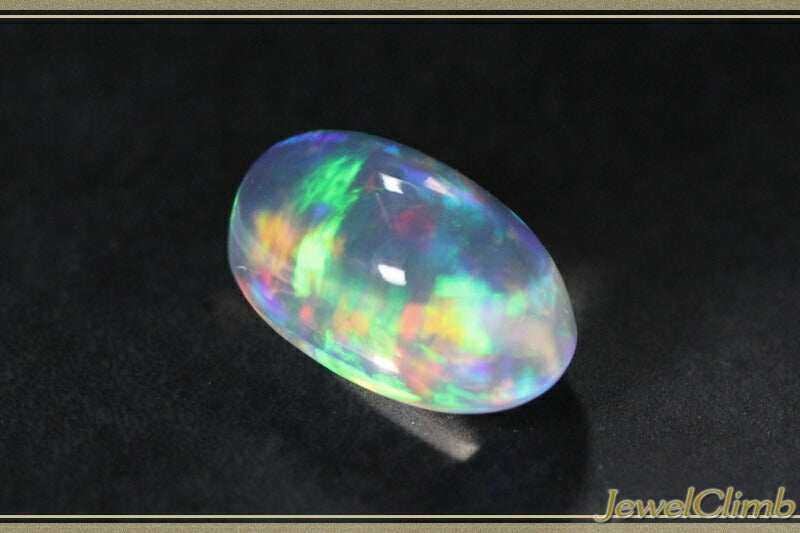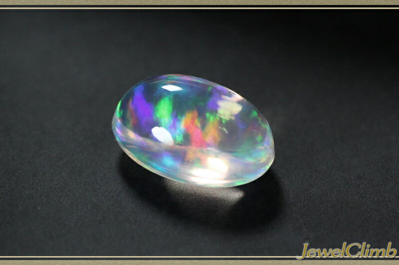 高い透明度を誇るクリアーなカボション結晶ふっくらとした高さのあるカボションカットを施され虹色の遊色が浮かび上がるウォーターオパール! その名のとおり水のような綺麗な透明度を持つ宝石。 深さのあるスタイルを持つため、虹色の遊色はゆらゆらと豊かに結晶内を踊るかのよう。 オレンジレッド、グリーン、ブルーやバイオレットのまさに虹を眺めているような遊色で幻想的な世界を魅せてくれます。 希少性が高い透明度の高い姿を魅せそしてこの鮮明で美しい遊色を見せるものは数多く存在するものではなく非常に貴重な存在です! 今後ますます入手することが困難になると予想される高品質なウォーターオパール。 遊色が華やかに踊る美しい一石を是非ともお楽しみください! |