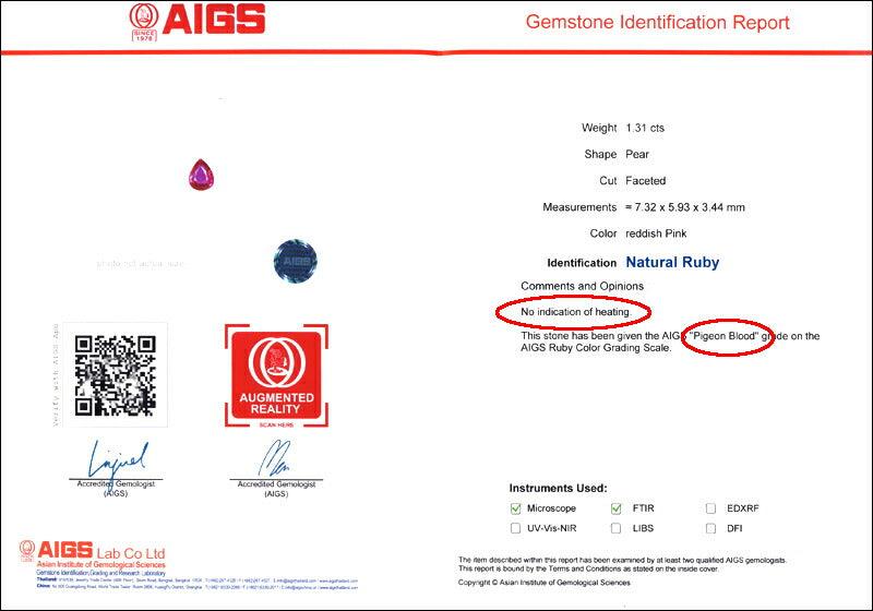 【AIGS非加熱ピジョンブラッド鑑別書付き】 鮮やかなカラーに魅了される 非加熱ピジョンブラッドルビー1.31CT